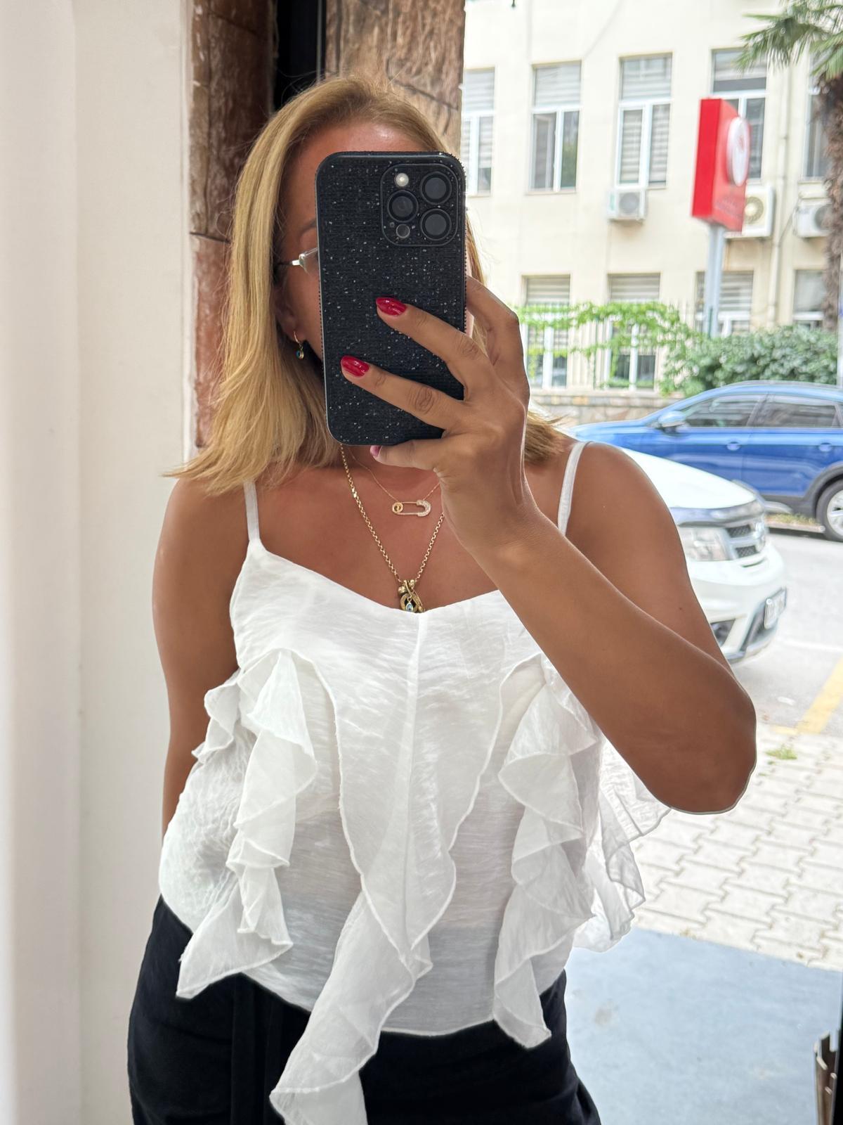 Önü Fırfırlı Askılı Tül Bluz Beyaz