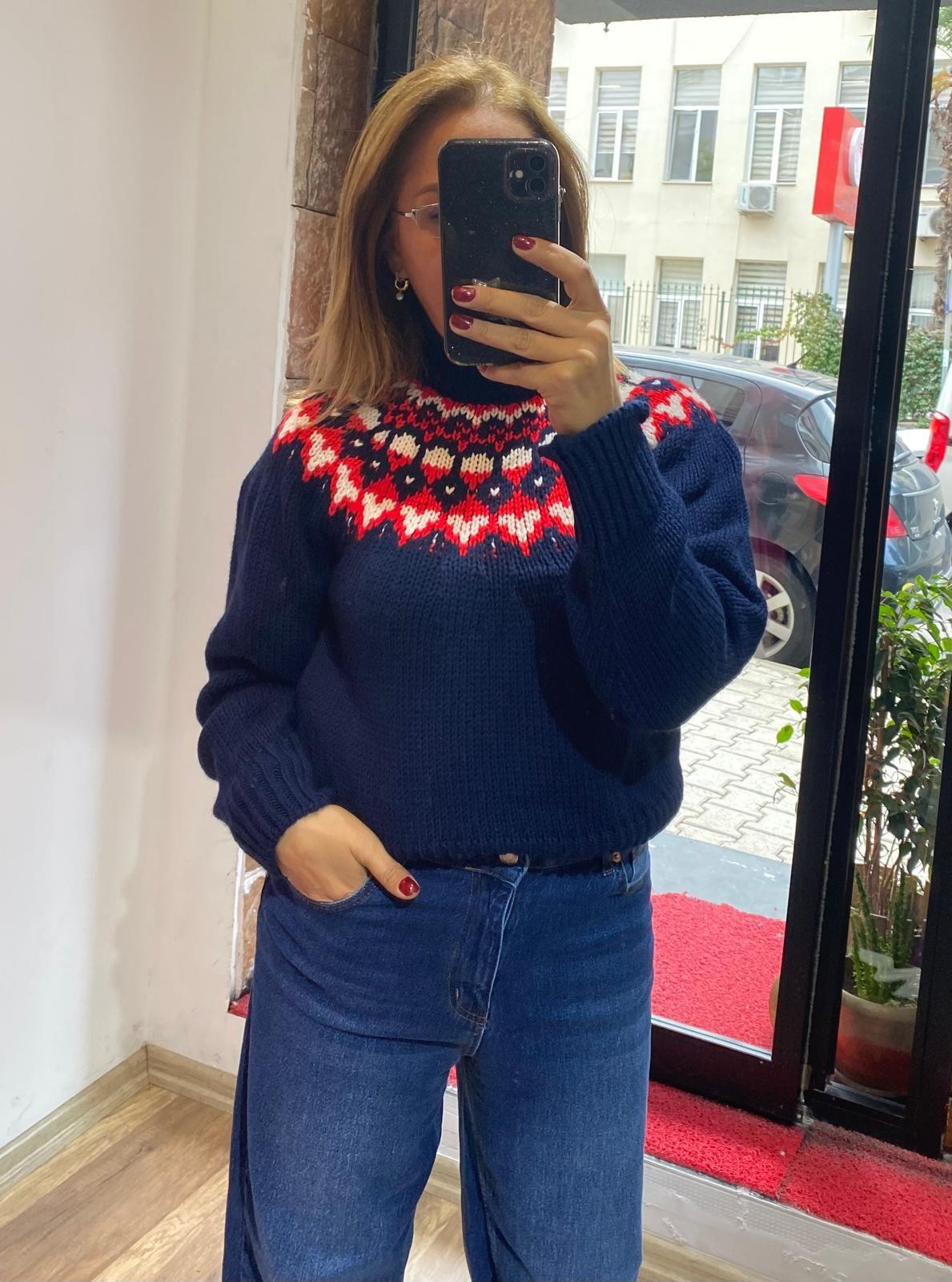 Lacivert üzeri desenli premium şık kazak.Dolabınızda bu şık parçaya yer açmalısınız.