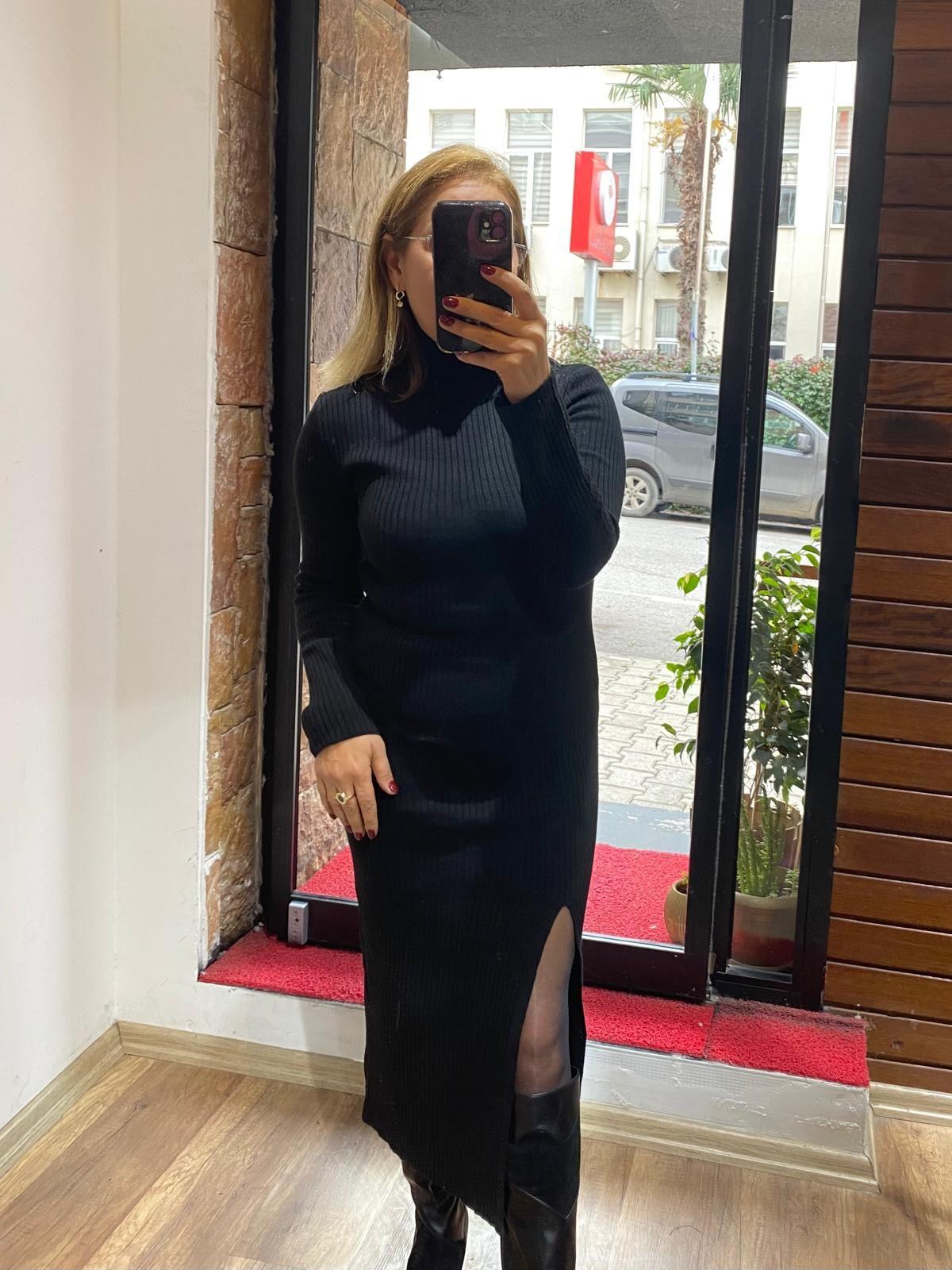 Balıkçı yaka yan yırtmaçlı triko elbise